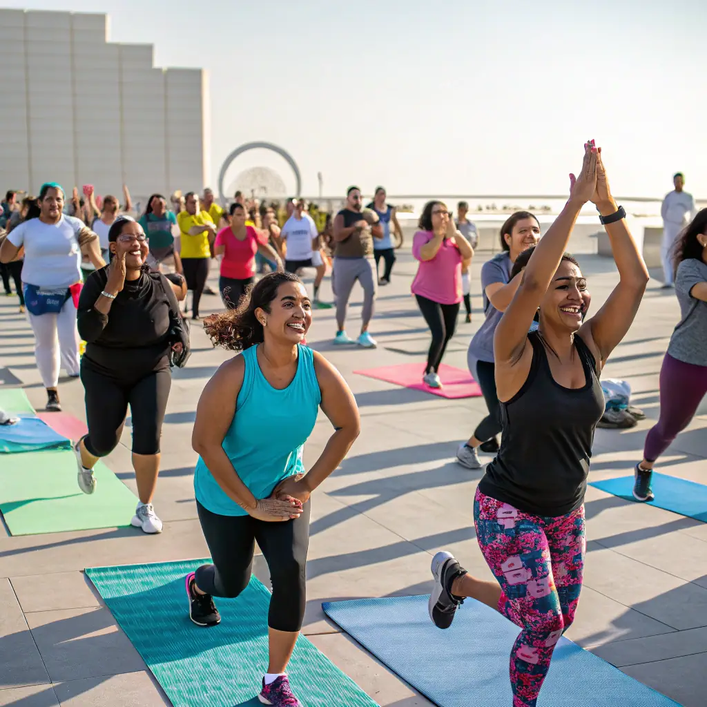 A vibrant image of a group of adults participating in an aerobics class at ASSOCIATION GYMTAVIE, showcasing energy and community.